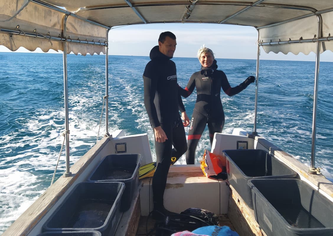 Međutim, nakon veselja što su kolektori pronađeni na prvoj lokaciji u podmorju Poreča, uslijedilo je i dodatno veselje već pri sigurnosnom zastanku na 5 m dubine – jedna je periskica virila iz kolektorske vreće i spremno je pozirala!