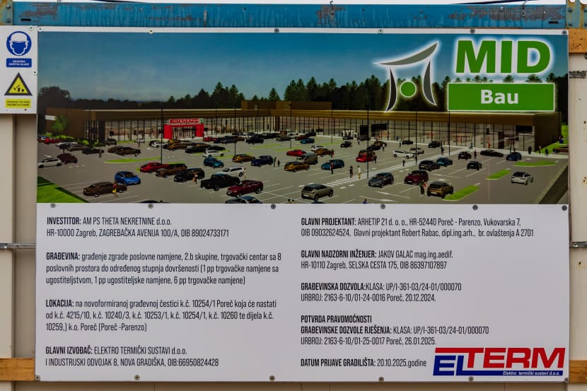 Građevinska dozvola izdana je 2024. godine u prosincu, a početak gradnje je prijavljen koncem listopada prošle godine. Na licu mjesta se pak čini da se gradilište prostire sve do ranije spomenute dvije parcele u vlasništvu Retail park Poreča, koji za svoju investiciju još nije zatražio građevinsku dozvolu.