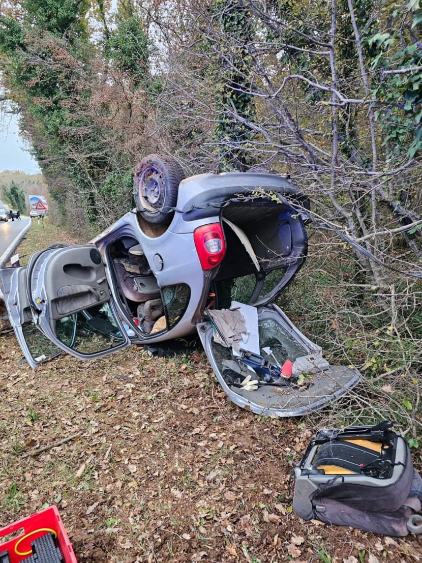 Nesreća se dogodila kada je 68-godišnjak upravljao automobilom, pulske registracijske oznake, a dolaskom do blagog zavoja, automobilom je sletio na travnatu površinu s desne strane. Vozač se potom opet vratio na kolnik, a onda je u zanošenju ponovno sletio s desne strane, udario u stabla i prevrnuo se na krov. Vozač je u nesreći lakše ozlijeđen.
