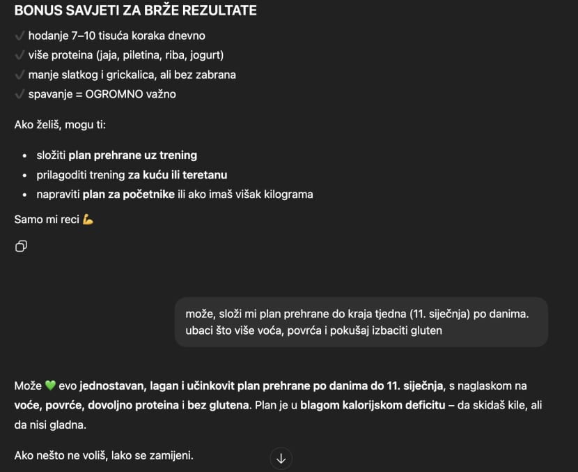 A što je s hranom s početka našeg druženja? Tu je još lakše. AI složi meni za cijeli tjedan, ubaci recepte, kalorije, podsjetnike... Samo je pitanje koliko ćete se toga držati kad nakon napornog dana zaskoči Glovo reklama.