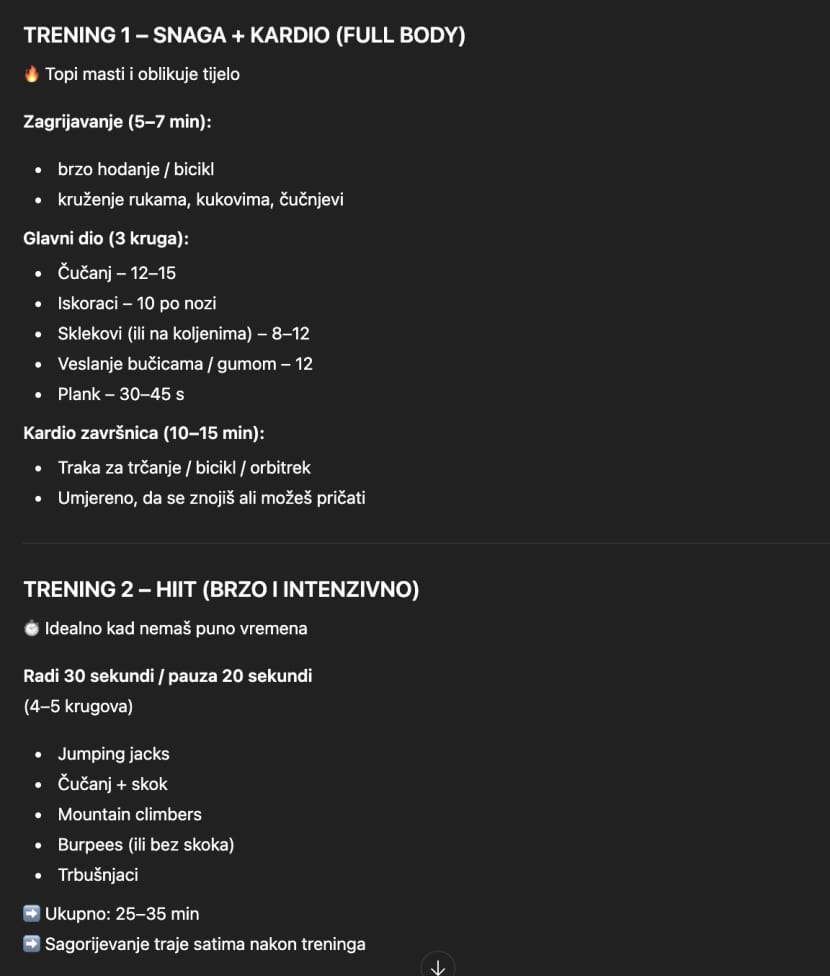 Odgovor, koristeći besplatnu verziju, bio je najprije prijateljski nastrojen i pokušao je dati notu razumijevanja, a zatim klasično - ponudio više smjernica poput konkretne raspodjele vježbi i pisanja plana prehrane o kojima će biti više detalja kroz članak.