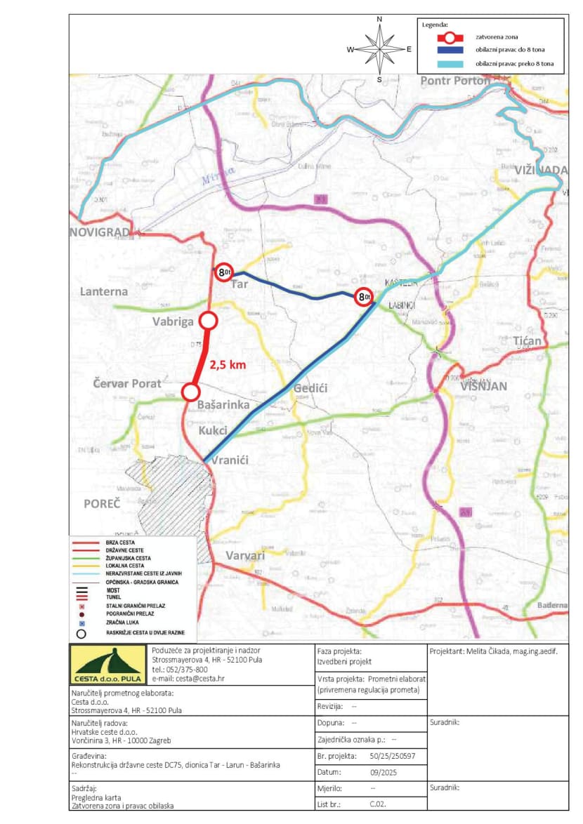 Obilazni pravac u oba smjera osiguran je preko Tara i Kaštelira za vozila nosivosti do 8 tona, a preko Novigrada, Ponte Portona, Vižinade i Kaštelira za vozila peko 8 tona, odgovorili su na naš upit iz Hrvatskih cesta.
