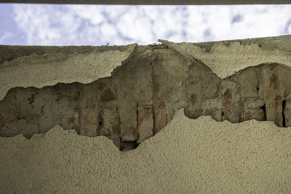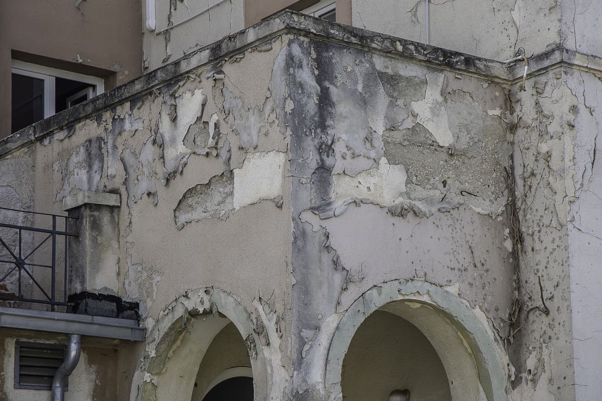 U unutrašnjosti kompleksa dijelovi plavo obojanog zida su oguljeni, a ostale su bijele rupe.