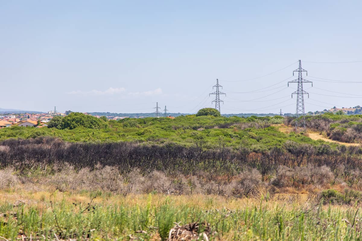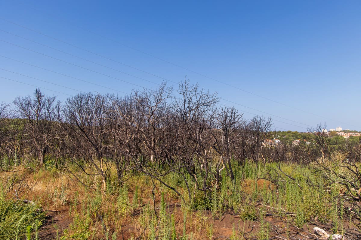 U fotografijama našeg reportera Manuela Angelinija, tragovi velikog požara, koji je zbog otvorenog plamena nepoznatog porijekla izbio 9. srpnja oko 11.40 sati s istočne strane Premanturske ceste ispod stupa dalekovoda, još uvijek su prisutni i vidljivi, kako u tada izgorenim stablima i raslinju, tako i u ostacima oštećenih predmeta.