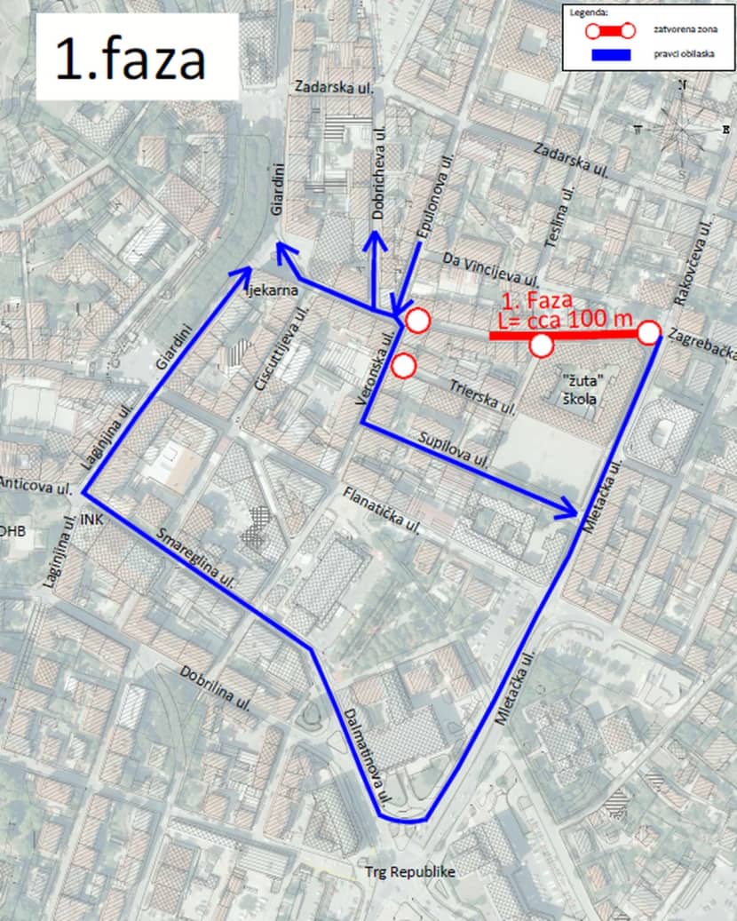 U prvoj fazi, koja će trajati do 12. studenog, predviđeno je zatvaranje predmetne dionice, osim za vozila gradilišta, od križanja s Rakovčevom do križanja s Veronskom ulicom. Obilazni pravac osiguran je preko Mletačke, Dalmatinove, Laginjine i Giardina. Obilazni pravac za Dobrichevu, Veronsku i Supilovu ulicu je preko Zadarske i Epulonove.
