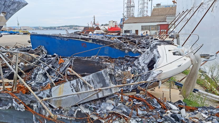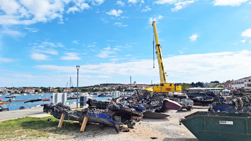 Apokaliptični prizori na prostoru slobodne zone Luke Pula, na kojoj su odložene podrtine izgorjelih brodica nakon požara u medulinskoj luci i dalje "krase" pejzaž s pogledom na pulski zaljev.