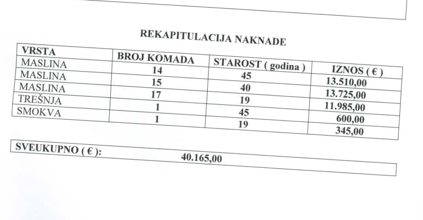 U studenom je pak u Gradu Puli sastavljen zapisnik kojim je prethodno usuglašena isplata tržišne vrijednosti nasada. Procjembeni elaborat stalnog sudskog vještaka Serđa Bilea utvrdio je vrijednost nasada u ukupnom iznosu od 40.165 eura, što je iznos koji bi Grad Pula trebao isplatiti neformalnom posjedniku. Time bi Grad stekao daljnje korištenje i raspolaganje nekretninama koje čine dio budućeg reciklažnog dvorišta.