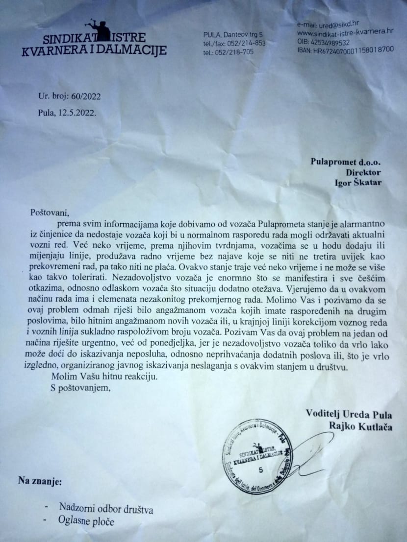 Čelnik pulskog Sindikata Istre, Kvarnera i Dalmacije (SIKD) Rajko Kutlača poslao je minulog petka aktualnom direktoru Igoru Škataru i Nadzornom odboru dopis u kojem traži hitnu reakciju na „alarmantno stanje“ u Pulaprometu.