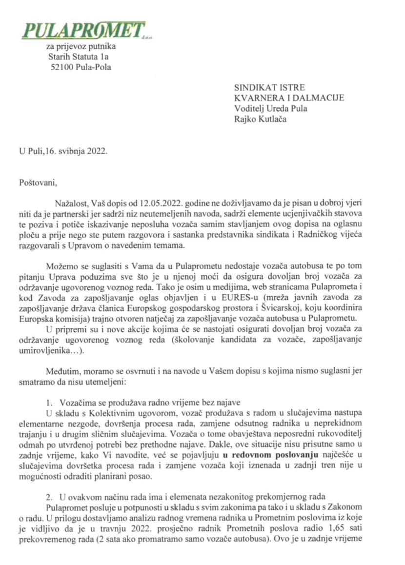 „Uprava poduzima sve što je u njezinoj moći da osigura dovoljan broj vozača za održavanje dogovorenog voznog reda“, brani se Škatar te obrazlaže da je oglas za zapošljavanje, osim u medijima, web stranicama Pulaprometa i na Zavodu za zapošljavanje, trajno objavljen i u EURES-u (mreža javnih zavoda za zapošljavanje država članica Europskog gospodarskog prostora i Švicarskoj).