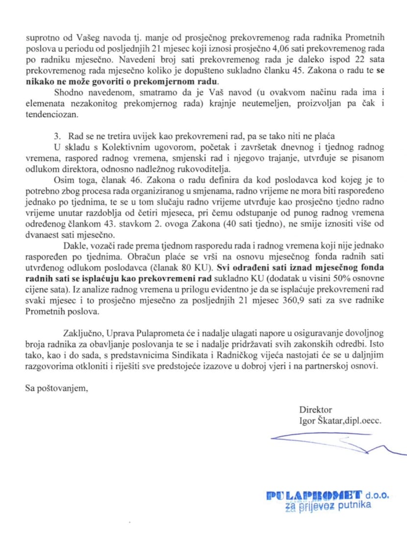 Škatar također navodi da u Pulaprometu nema prekomjernog rada kao i da se svi mjesečni sati iznad mjesečnog fonda radnih sati isplaćuju kao prekovremeni rad.