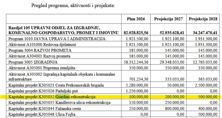 Kako je iz projekcija proračuna za naredne dvije godine vidljivo da je najveći iznos, od čak pola milijuna eura, za obnovu Giardina "prebačen" u 2028. godinu, Komunalnu smo palaču upitali i znači li to da se prvi radovi mogu očekivati tek tada.