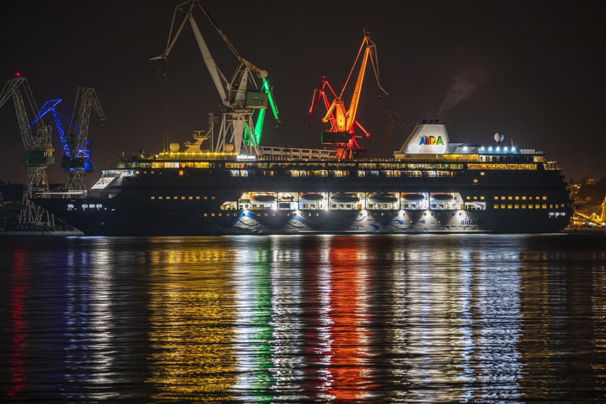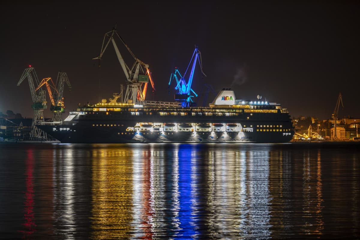 Pulska luka noću izgleda šarena poput velegrada. Dizalice koje svijetle u svim mogućim bojama, a ispred njih privezan velebni kruzer AIDAmira.