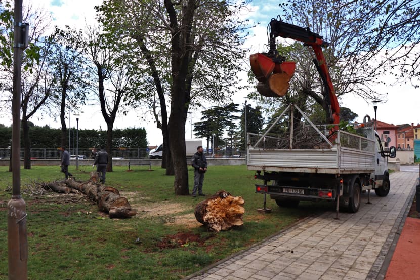 S uklanjanjem stabala nastavili su djelatnici gradskog komunalnog poduzeća Usluga Poreč, koji su od ranog jutra na terenu. U olujnom je naletu palo je stablo na vozilo u uvali Peškera, uništen je drveni molić, te su stradali štandovi/kućice uz more.