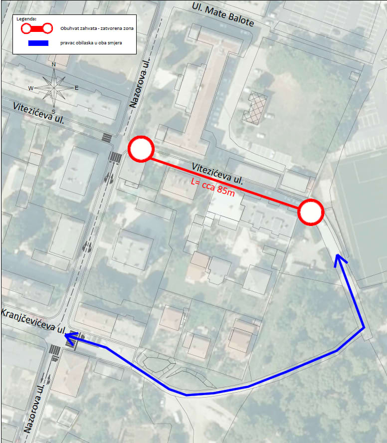 Uvesti će se privremena regulacija prometa kojom je predviđeno zatvaranje predmetne dionice Vitezićeve ulice od raskrižja sa Nazorovom ul. u smjeru makadama u dužini od cca 85 metara za sva vozila osim vozila gradilišta.