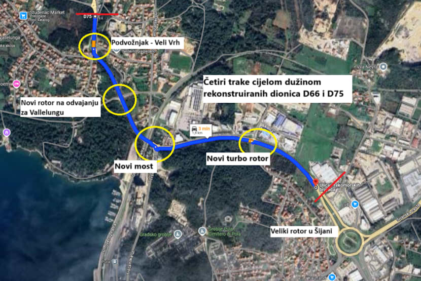 Kao što smo više puta pisali na Istra24, najveći noviteti koji ovom obnovom stižu, bit će podvožnjak na Velom Vrhu, novi veliki kružni tok na odvajanju za Valelungu, dodatni nadvožnjak na spoju s Tršćanskom te još jedan kružni tok na križanju s Vitasovićevom ulicom i odvajanju za industrijsku zonu.