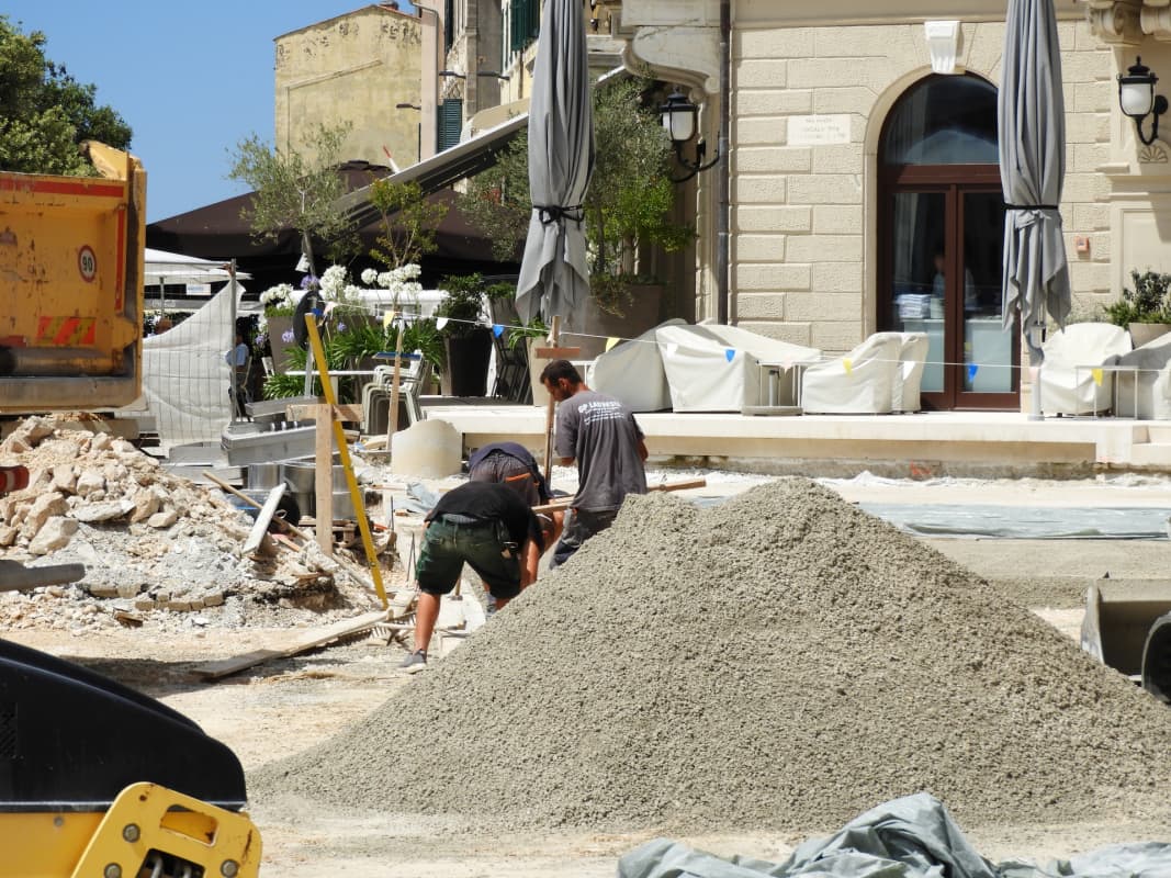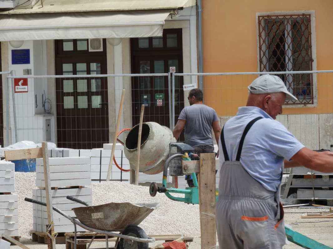 I pogled na jednu od najljepših riva na Jadranu zaklonjen je gomilom materijala koji čeka ugradnju u trg, a na terasama obližnjih ugostiteljskih objekata vidljiva je prašina koja leti s gradilišta. Zanimljivo je da turisti u potrazi za slobodnom stolicom, ne obraćaju previše pažnju na cijelu situaciju.