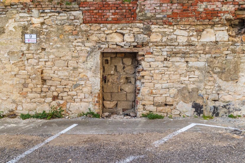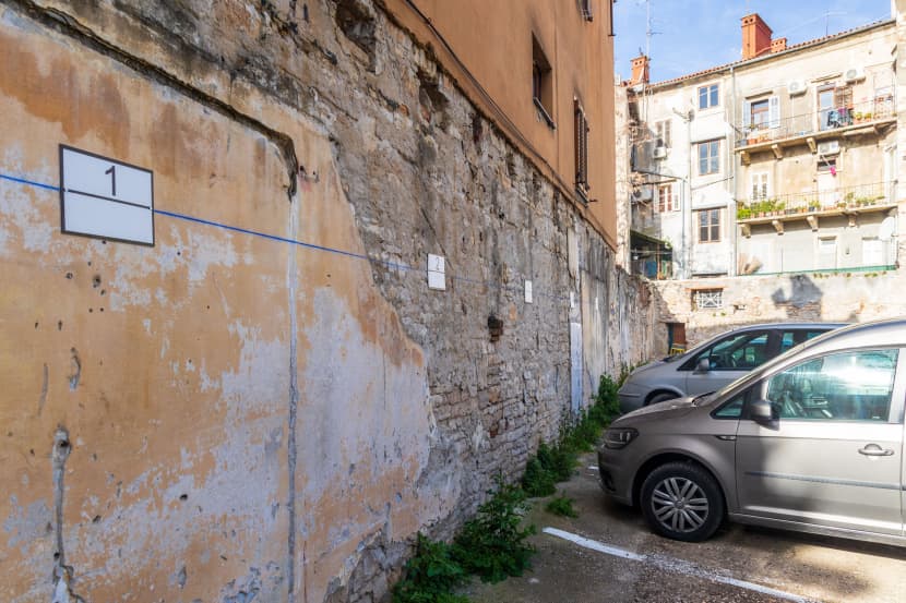 Parkiralište smo zatekli u funkciji, zatvoreno rampom i s označenim i numeriranim parkirnim mjestima. Na spornom vanjskom zidu zgrade vidljivi su tragovi stoljetnih oštećenja i spojeva sa zgradama koje su u međuvremenu srušene, ali nismo zatekli trenutne radove.