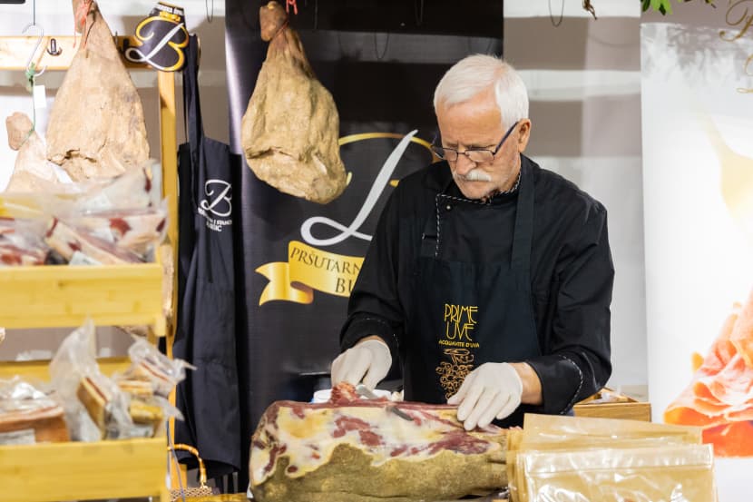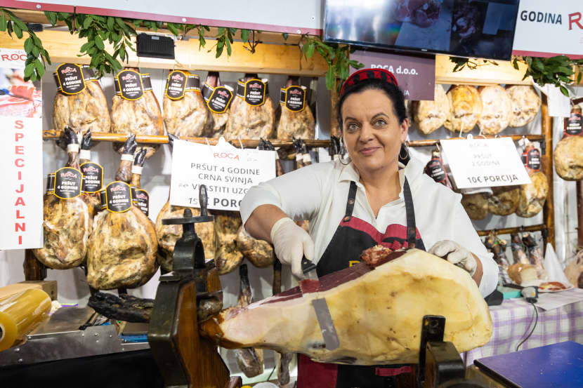 Među prvima susreli smo predstavnike klastera Crnogorski pršut iz Cetinja, koji su u posljednja tri dana u Istri predstavljali nekoliko nagrađenih proizvoda, uključujući i zlatom ovjenčani pršut Monstatea ili, kako bi se u Crnoj Gori reklo - pršuta!