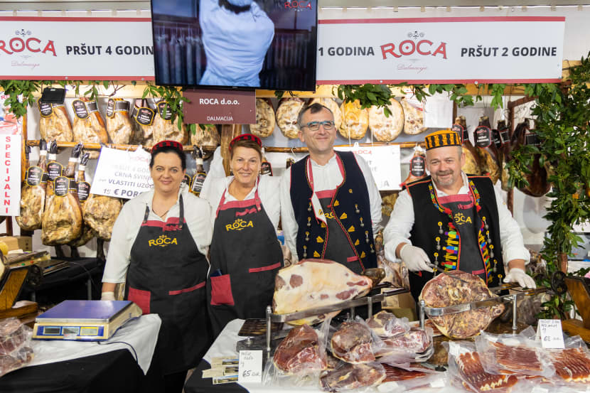 - Mi smo gospodarstvo Roca iz Dalmacije. Dolje u zaleđu Vodica, kod sela Stankovci, imamo kompletnu priču. Vi biste u Istri rekli stancija, a mi kažemo imanje, koje se sastoji od farme svinja, pršutane i restorana i trgovine. Uz, naravno, vinograde i maslinike, ljudima prezentiramo kako je nekada to izgledalo jer obrađujemo meso isključivo na tradicionalan način, konzervirajući ga s krupnom morskom solju, ali opet, za razliku od Istrijana, mi ga i dimimo. Također kako su to radili naši stari. U pitanju je takozvano hladno dimljenje, za koje se koristi isključivo grabovo drvo posječeno godinu dan ranije, dehidrirano i bez smole, ono je kod nas puno kaloričnije nego u Istri jer ima manje vode i daje poseban šmek. Taj dim ujedno ima i sterilizacijska svojstva, kaže nam Frane iz gospodarstva Roca.