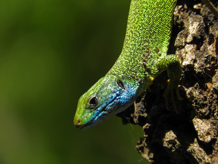 Nemojte pomisliti kako gušteri žive samo na tlu, ponekad će se on popeti na stablo i osmotriti okolicu, pa tako i ovaj zelembać koji će vam sigurno upasti u oko svojim jarkim bojama.