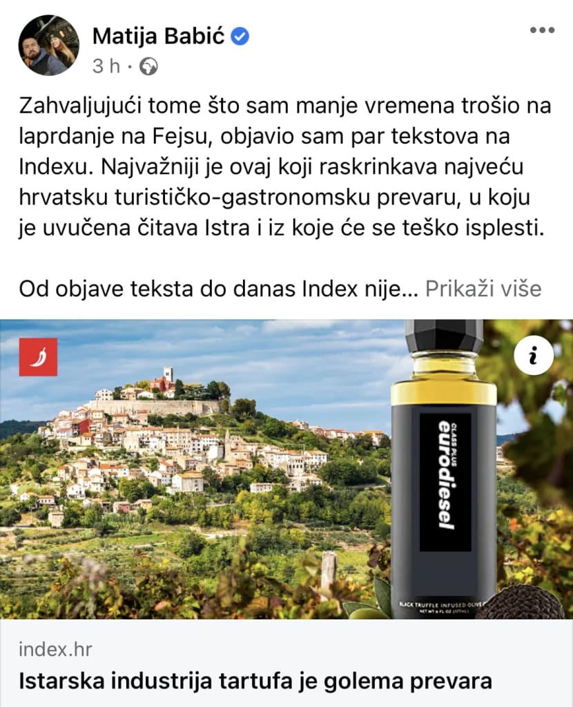 "Zahvaljujući tome što sam manje vremena trošio na laprdanje na Fejsu, objavio sam par tekstova na Indexu. Najvažniji je ovaj koji raskrinkava najveću hrvatsku turističko-gastronomsku prevaru, u koju je uvučena čitava Istra i iz koje će se teško isplesti", napisao je osnivač portala Index i gastronomske platforme TasteAtlas, Matija Babić, danas na svom Facebook profilu, referirajući se na svoj tekst "Istarska industrija tartufa je golema prevara". U obajvi je napomenuo da oOd objave teksta do danas Index nije zaprimio niti jedan ispravak ni demanti ni komentar proizvođača ili restorana. Samo muk".