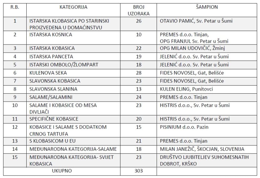 Najveći broj bodova osvojio je OPG Milan Udovičić iz Žminja, koji je time ponio titulu šampiona sajma i osvojio šampionsku kobasičarsku štafetu.