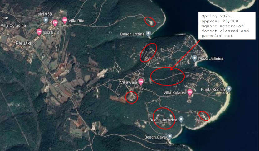 "Većina ove guste šume (gotovo 15.000 m2) kupljena je u veljači 2022., iskrčena i potom podijeljena na 29 parcela od koji je već 16 prodano. Izgradnja septičkih jama i cisterni već je u tijeku. Molimo pomozite spriječiti još jednu katastrofu!! Kad se počne graditi na prodanim parcelama bit će kasno za sanaciju prirode!