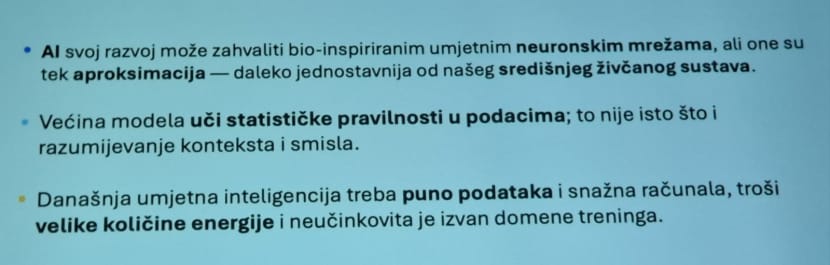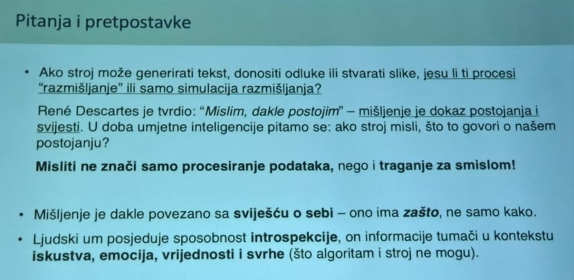 - To je tehnologija koja zadire u našu antropološku prirodu. Čovjek nikad nije u svojoj povijest došao tako blizu razvoju artefakata koji se mogu natjecati s našom kognitivnom dominacijom. Kognicija je naša najdublja posebnost. Umjetna inteligencija je ontološko, moralno i sociološko pitanje. Nameće pitanja o smislu, granicama i svrsi ljudskog postojanja, zbog čega njezino razumijevanje zahtjeva filozofski dijalog, kazao je u uvodu Jerbić, da bi predavanje zaključio riječima: "Budućnost neće pripasti strojevima koji postaju sve sličniji nama, već onima koji znaju kako biti ljudi u svijetu strojeva, odnosno onima koji posjeduju ono što strojevi nikada ne mogu imati - ljudskost, snove, empatiju, moral...".