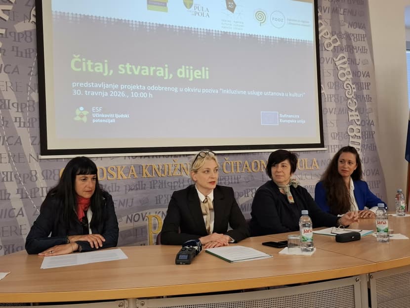 U dvorani Gradske knjižnice i čitaonice Pula 30. travnja 2026. 10 sati održana je konferencija za medije na kojoj je predstavljen projekt „Čitaj, stvaraj, dijeli“ čije je financiranje odobreno u okviru poziva “Inkluzivne usluge ustanova u kulturi” Europskog socijalnog fonda+ Učinkoviti ljudski potencijali. Nositelj projekta je Gradska knjižnica i čitaonica Pula, a partneri Grad Pula-Pola, Sveučilište Jurja Dobrile u Puli, IKA - Istarska kulturna agencija - Agenzia culturale Istriana.