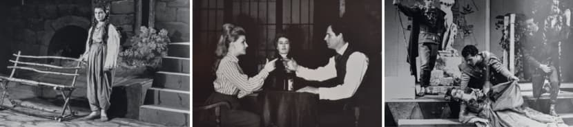 (Privatna foto arhiva:11-godišnja Neva Rošić 1946. u prvoj ulozi u ‘Hasanaginici’; s Nelom Eržišnik i Borisom Buzančićem u ‘Sablastima’ 1963.; Neva Rošić kao Tirena 1959.)