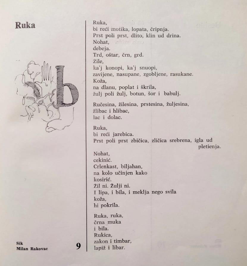 (Milan Rakovac je sakramenskoj Sunčici pročitao pjesmu "Ruka" iz svoje zbirke poezije "Sik" iz 1980.)