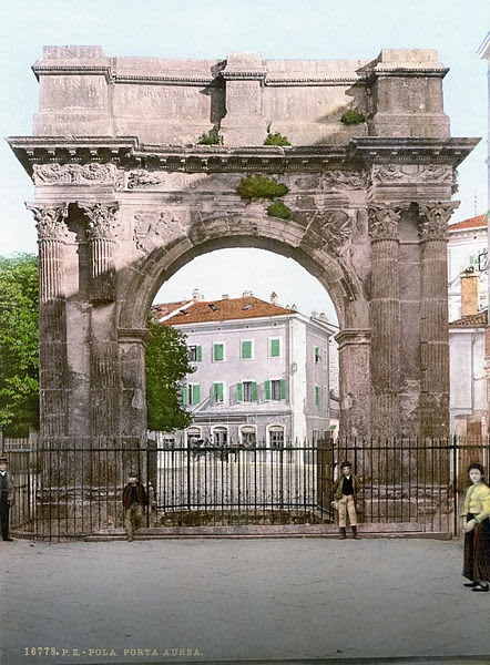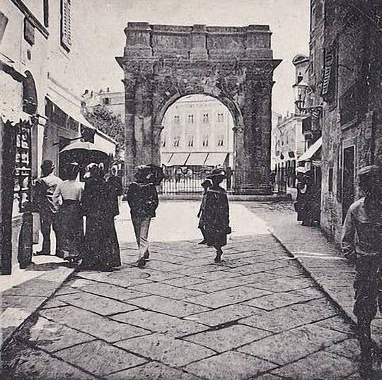 Dakle, sve do 1838., na lokaciji kod Slavoluka Sergijevaca nije bilo trga, kao što se vidi iz slika i crteža što su nam ih u 18. stoljeću ostavili Giovanni Battista Piranesi, Louis-François Cassas, Charles-Louis Clérisseau i James Stuart. Primjetno je da je istočna strana Slavoluka Sergijevaca gotovo dodirivala gradska vrata koja su nalazila u pojasu obrambenih zidina. Već za vrijeme Rimljana s vanjske strane vrata nalazile su i dvije četvrtaste obrambene kule.