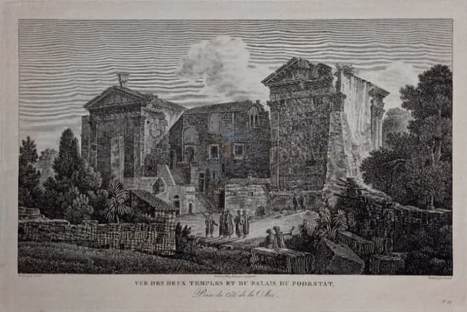 Stražnji dio Komunalne palače, koja još uvijek čini cjelinu s Augustovim i Dijaninim hramom, u crtežu Louis-François Cassasa iz 1882.