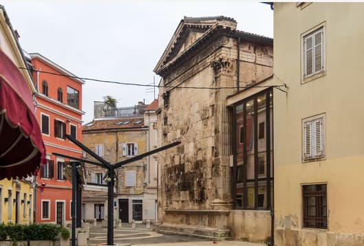 O tome smo opširno pisali ovdje, podsjetit ćemo samo da dolaskom Oktavijana, sa svake strane već postojećeg hrama posvećenog trijadi bogova Jupiteru, Junoni i Minervi (a možda Herkulu) 2. i 14. godine, grade se dva nova hrama. Prvi se gradi sjevernije, a to je danas gotovo nevidljiv Dijanin hram, a potom Augustov hram. Dijanin je vidljiv samo sa stražnje strane, kao dio začelja komunalne palače zbog čije je gradnje stradao veliki središnji hram s osam stupova.