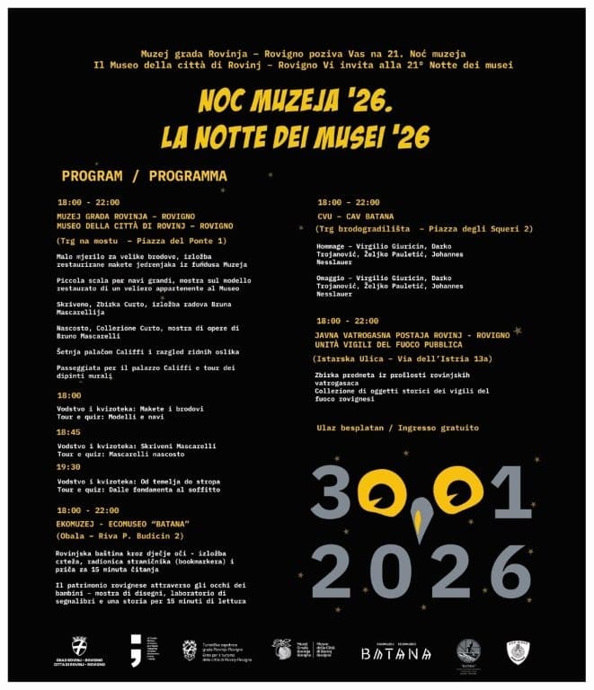 Ovogodišnja rovinjska Noć muzeja tako povezuje industrijsku, pomorsku, umjetničku i obiteljsku baštinu grada te doživljaj različitih slojeve lokalne povijesti.