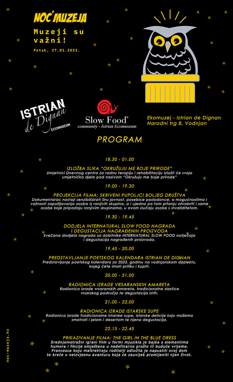 Program započinje u 18 i 30 sati otvorenjem izložbe slika ''Okružuju me boje prirode'' Dnevnog centra za radnu terapiju i rehabilitaciju iz Pule koju će posjetelji moći pogledati za vrijeme trajanja Noći muzeja. Članovi udruge Istarsko – Ekomuzej iz Vodnjana ovom će prilikom predstaviti poetski kalendar za 2023. godinu na vodnjanskom dijalektu.