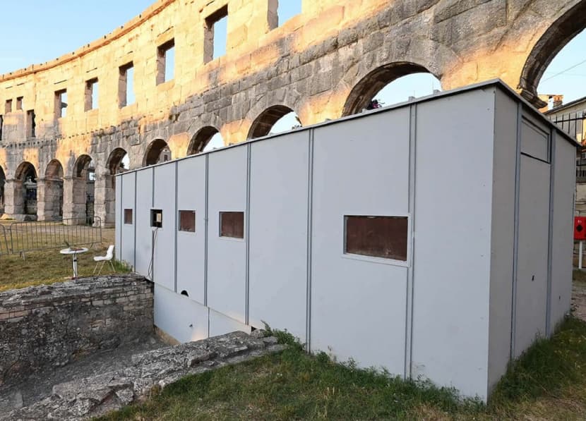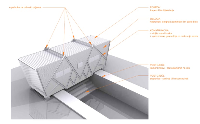 - Zato se iz točki ovjesa za podizanje kranom granaju nosivi krakovi nalik na obrnutu krošnju stabla. Glavni zahtjev je da se nova projekcijska kabina smjesti na datu poziciju u Areni svega par dana prije Filmskog festivala i zatim ukloni nakon zatvaranja, tako da originalni prolaz usječen u tribini, koji je desetljećima bio zatvoren, ostaje slobodan i prohodan. S druge strane, kad se već takvoj konstrukciji posvećuje posebna pažnja, odlučili smo ju ostaviti vidljivom, iskrenom i jasnom, kao što i našu Arenu karakterizira njena nosiva konstrukcija, plašt s nizom iskrenih konstruktivnih elemenata, nastavlja on.