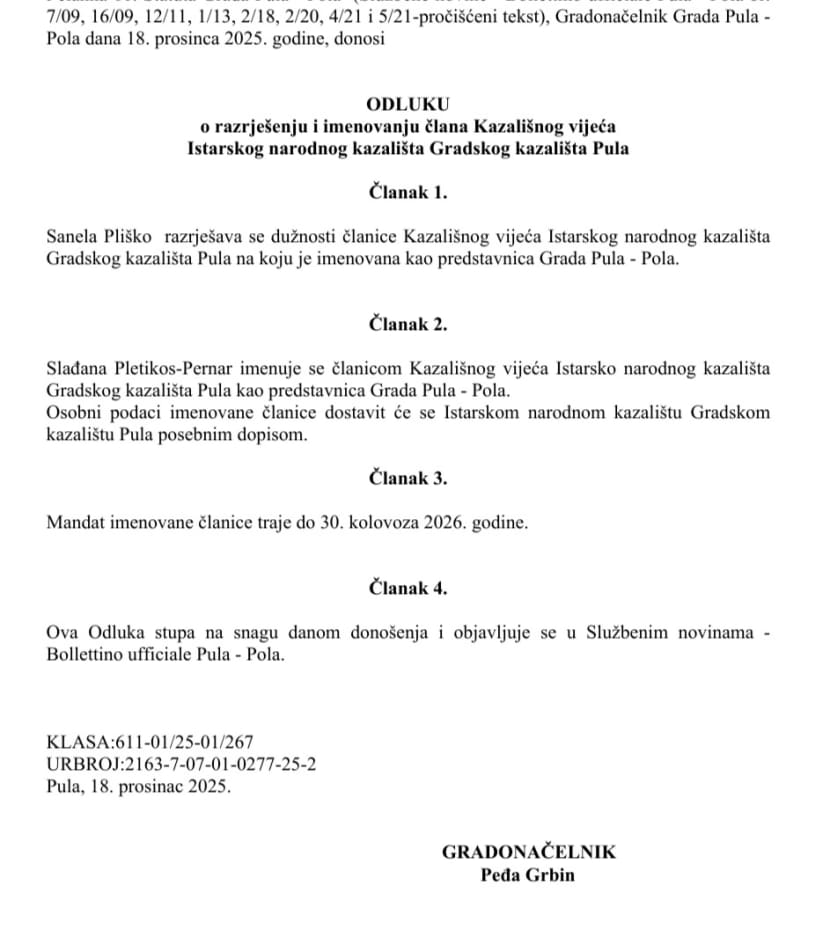 Bez najave i bez ijedne riječi obrazloženja, u partijskoj maniri, gradonačelnik Pule Peđa Grbin jučer je pismenom odlukom razriješio članicu Kazališnog vijeća Istarskog narodnog kazališta - Gradskog kazališta Pula Sanelu Pliško kao predstavnicu Grada u tom, što je važno za ovu priču, ključnom tijelu koje provodi aktualni, prošlog tjedna raspisani natječaj za novog ravnatelja/icu INK-a.