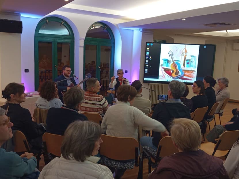 S crvenim rupcem oko vrata – kao posvetom Rovinju – i svojom gitarom, uz pratnju muzikologa Alessija Giuricina na basu, u prepunoj dvorani, pjevanjem uživo ili kroz prikazane videe, Bosazzi, nagrađen stalnim pljeskom publike, darovao je prisutnima širok presjek svoje karijere u kojoj su se izmjenjivali i isprepletali različiti glazbeni i tekstualni putevi.