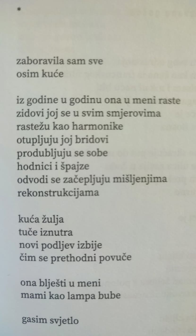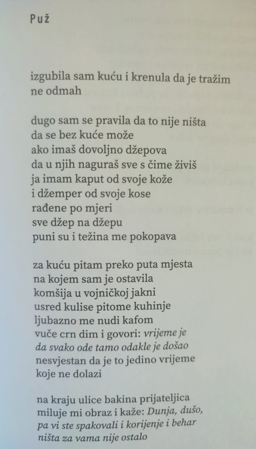 U izravnom kontaktu s autoričinim promišljanjima i stavovima te njenom poezijom, koja se posebno u uvodnom ciklusu 'Kuća' temelji na izbjegličkom iskustvu koje je koncem rata iskusila kao djevojčica u rodnoj Banjaluci, publika je mogla osjetiti da je, kako je ustvrdio urednik zbirke Kruno Lokotar, Dunjina kuća bitka, često britka, nikad pitka, ni ogorčena.