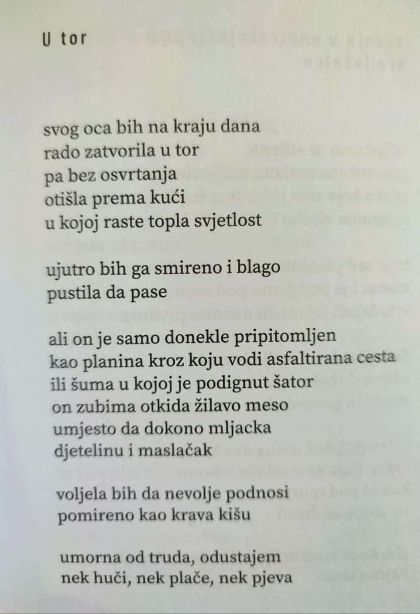 - Ljudi imaju određena stremljenja, želje, probleme, i čini mi se da su slični onima koje su ljudi imali prije 200 ili 50 godina. I to mi je magnet: napisati pjesmu, a da ima poveznicu s nečim što je jako staro. Naša suvremena poezija, koju mi pišemo, jest naše individualno iskustvo, a tradicija biva kao neki zbor, kolektivno iskustvo koje podržava pjesmu. Tada bude lakše čovjeku jer vidi da postoji neki kontinuitet i da smo slični, veli Dunja Bahtijarević.