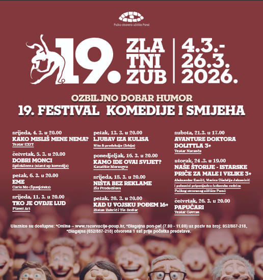 U svijetu koji se često doima preozbiljnim i opterećenim svakodnevnim brigama, postoje mjesta koja služe kao utočišta radosti i zajedništva. Jedno od takvih mjesta, već devetnaestu godinu zaredom, postaje Poreč tijekom mjeseca ožujka. Festival smijeha i komedije „Zlatni zub“ davno je prerastao okvire lokalne manifestacije i potvrdio status nezaobilazne kulturne točke na karti Istre i regije. Ovogodišnje izdanje donosi žanrovsku raznolikost kakvu publika dosad nije vidjela, spajajući tradiciju pučkog teatra s modernim stand-upom i svjetskom pantomimom.