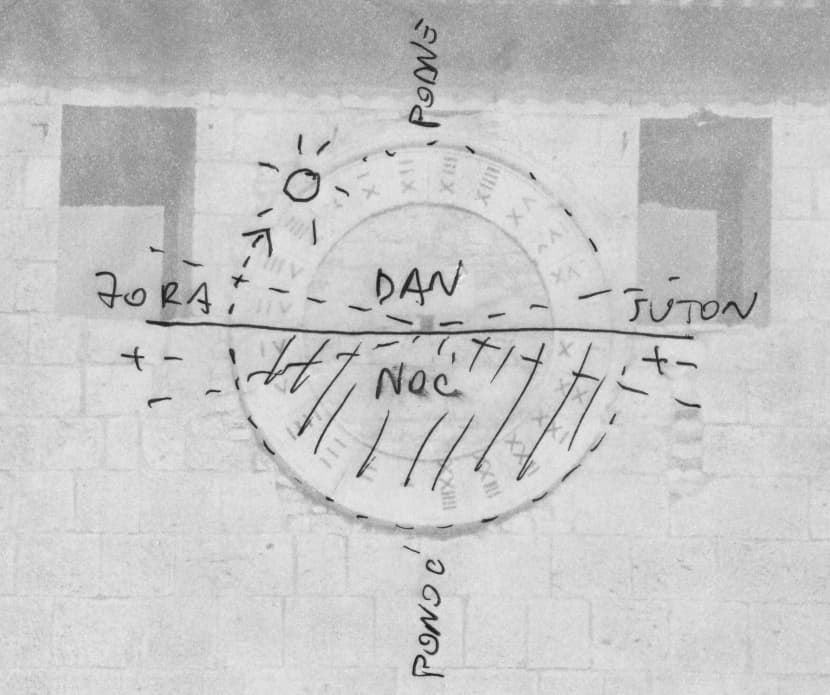 Sat ima samo jednu kazaljku: kad je sunce u zenitu kazaljka je prema gore, u ponoć kazaljka prema dolje