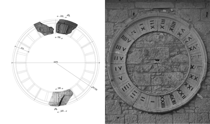 Već je prvi segment sata iz Dvigrada pokazao da je riječ o 24‐satnom kontinuiranom satu. Također, već je na prvom segmentu vidljivo da je sat iz Dvigrada također imao najstariju, punu transkripciju rimskih brojeva, što je vidljivo na broju XXIIII, baš kao i u Savičenti. Brojčanik sata iz Dvigrada nešto je manjih dimenzija od onoga u Savičenti. Temeljem izmjere fragmenata i njihove geometrijske rekonstrukcije, utvrđeno je da je promjer sata iz Dvigrada iznosio 228 centimetara, dok promjer sata u Savičenti iznosi 262 centimetara. Zbog brojnih stilskih i tehničkih podudarnosti, nametnulo se pitanje zašto su Dvigrad i Savičenta imali potpune iste satove, najvjerojatnije izrađene od iste radionice.