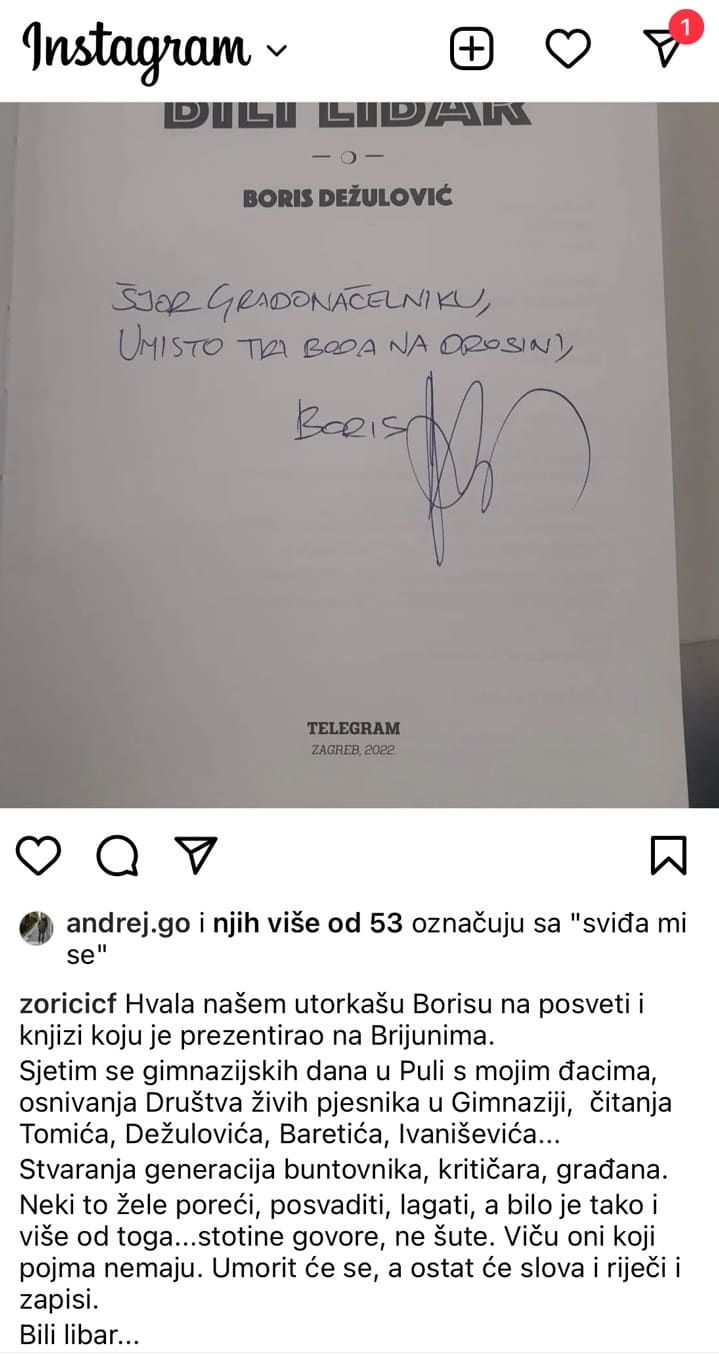 -Hvala našem utorkašu Borisu na posveti i knjizi koju je prezentirao na Brijunima. Sjetim se gimnazijskih dana s mojim đacima i osnivanja Društva živih pjesnika u Gimnaziji, čitanja Tomića, Dežulovića, Baretića, Ivaniševića. Stvaranja generacija buntovnika, kritičara, građana. Neki to žele poreći, posvaditi, lagati, napisao je na Instagramu pulski gradonačelnik Filip Zoričić koji je očito zaboravio skandal s gimnazijskim časopisom Žurnal