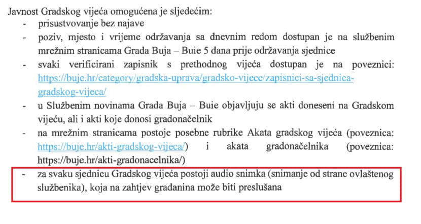 - Brojni gradovi i općine u Hrvatskoj redovito objavljuju video snimke ili prijenose svojih sjednica čime dodatno promiču transparentnost i povjerenje građana: Grad Buje ne bi trebao biti iznimka, smatra Janić. On je cijeli slučaj prijavio i Povjereniku za informiranje.