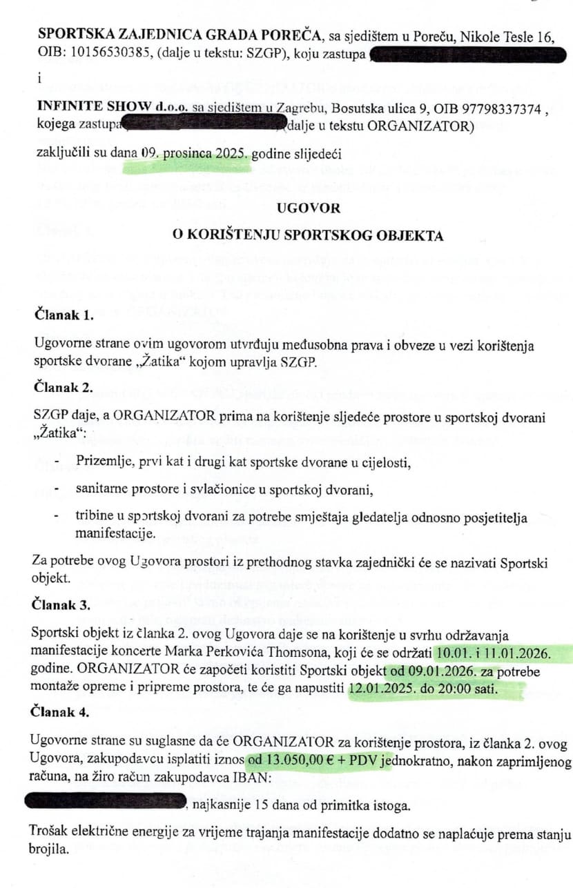 Na dokumentima je vidljivo da su već 9. prosinca ugovorena oba koncerta, iako je ovaj drugi najavljen tek danima nakon objave o održavanju prvog. U prvom ugovoru je dogovorena cijena iznosila 13.050 eura (plus PDV). Tada ugovor nije obuhvaćao zakup šankova i štandova te trošak najma kontejnera za odlaganje otpada, a zakup dvorane je bio dogovoren na četiri dana.