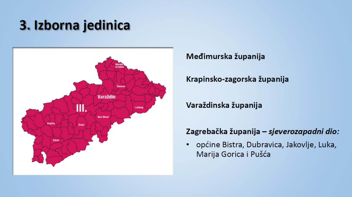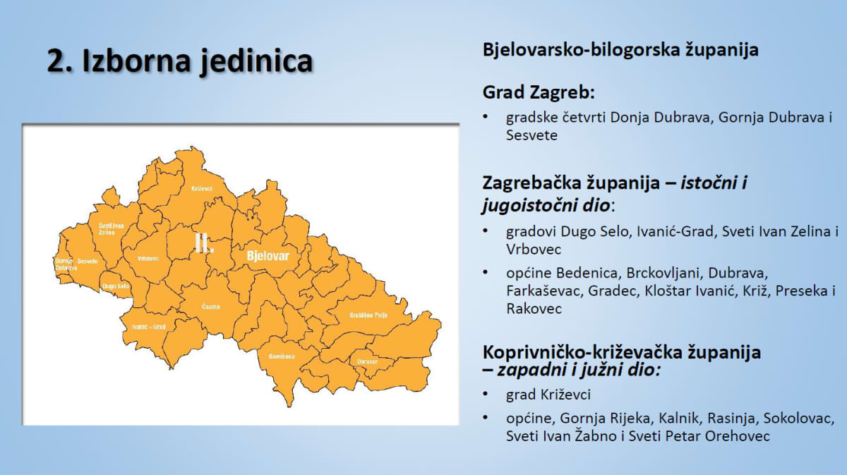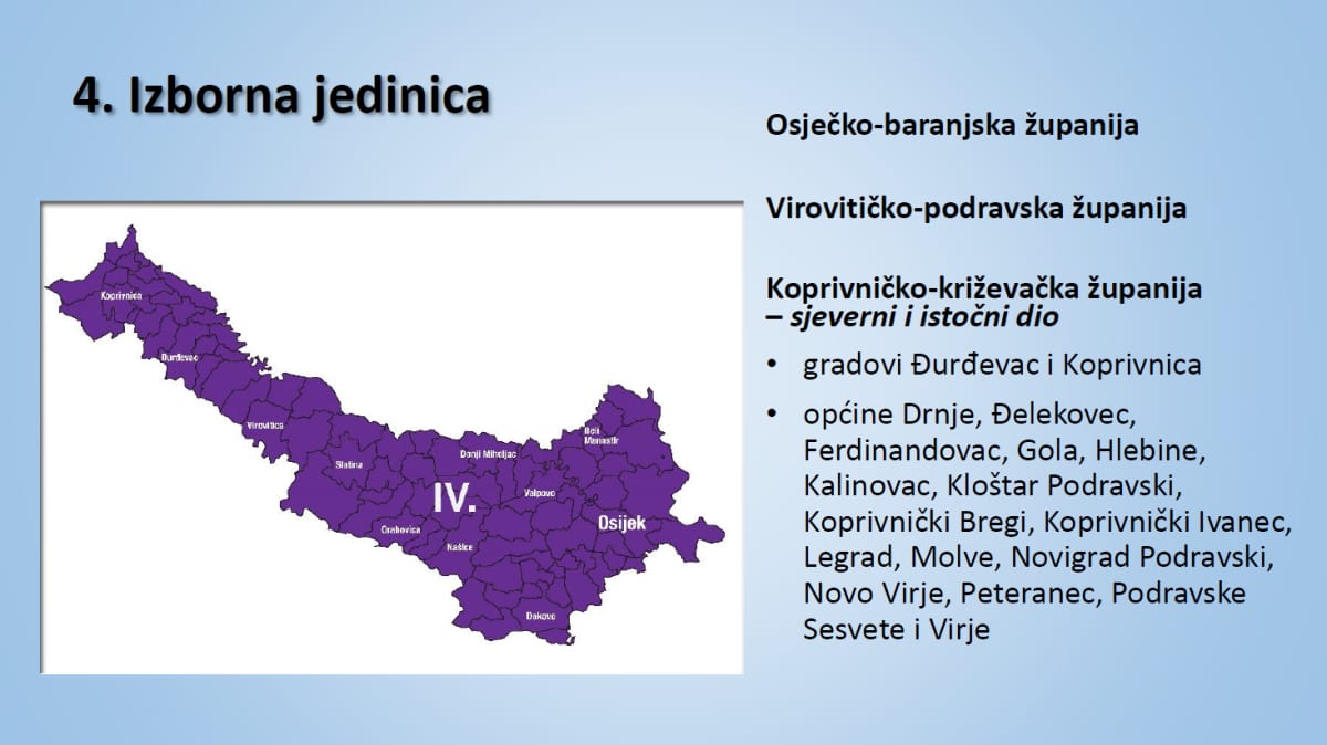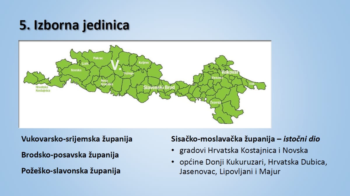 Slavonskim županijama, koje su do sada imale najveća odstupanja, u njihovim izbornim jedinicama pridodani su dijelovi sisačko-moslavačke (peta izborna jedinica), odnosno Koprivničko-križevačke (četvrta).