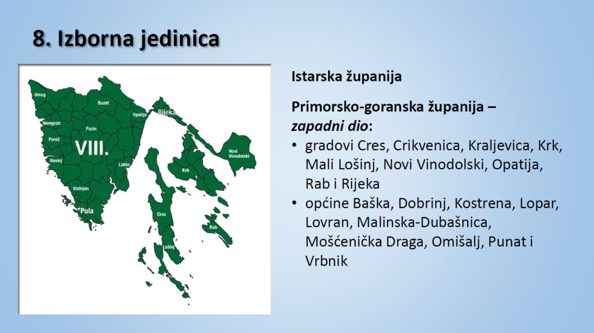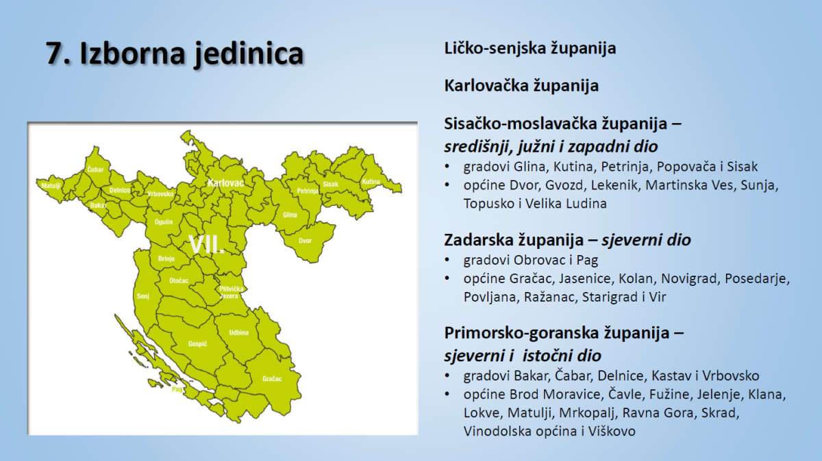 Geografski najveća je sedma izborna jedinica, ali je riječ o krajevima koji imaju najveći efekt depopulacije. Tu su cijela Ličko-senjska, Karlovačka, najveći dio Sisačko-moslavačke, sjeverni dio Zadarske te sjeverni i istočni dio Primorsko-goranske županije.