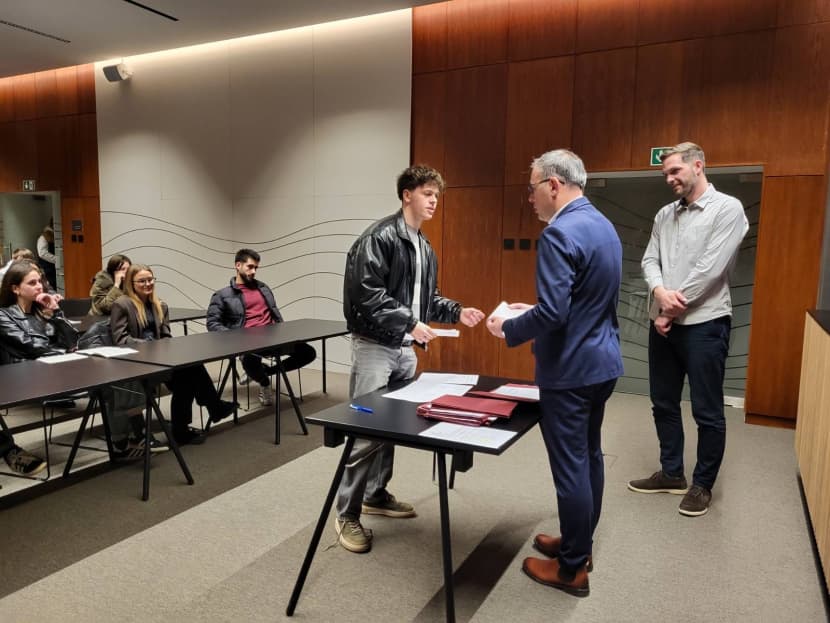 Gradonačelnik Donald Blašković, zamjenik gradonačelnika Goran Vlaćić te pročelnik odjela za društvene djelatnosti Borjan Batagelj u velikoj vjećnici Grada Labina primili su stipendiste na potpisivanje stipendija.
